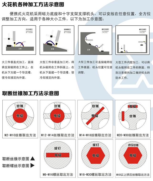 3、用專用工具:斷絲錐取出器,原理是工件和絲錐分別接上正負(fù)電極,中間灌電解液,導(dǎo)致工件向絲錐放電腐蝕,然后輔助尖嘴鉗等取出,對內(nèi)孔傷害很小
