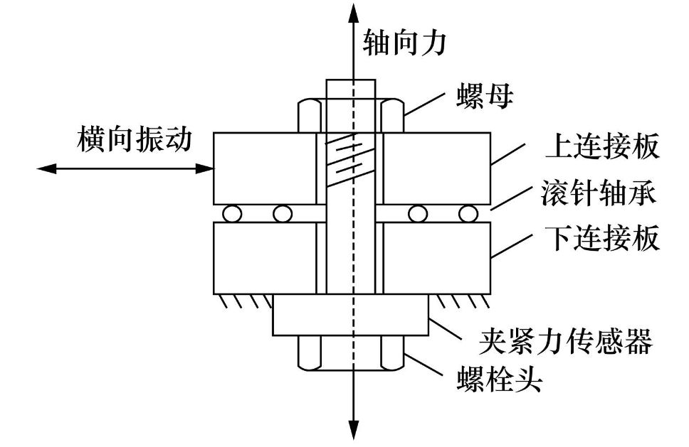 Junker橫向振動(dòng)試驗(yàn)機(jī)能模擬螺紋聯(lián)接在橫向交變載荷作用下的松動(dòng)過程[15]。圖1是在 Junker 橫向振動(dòng)試驗(yàn)機(jī)上進(jìn)行螺紋聯(lián)接松動(dòng)實(shí)驗(yàn)的示意圖。如圖1所示,螺紋聯(lián)接的下連接板固定,上下連接板之間通過滾針軸承連接。實(shí)驗(yàn)開始前擰緊螺母,使得螺母與螺栓頭之間夾緊,該夾緊力在數(shù)值上等于螺桿所受軸向力。夾緊力通過安裝在螺栓頭與下連接板之間的壓力傳感器測量得到。實(shí)驗(yàn)中,由具有調(diào)速機(jī)構(gòu)的電動(dòng)機(jī)驅(qū)動(dòng)可調(diào)偏心距的連桿產(chǎn)生橫向往復(fù)運(yùn)動(dòng)(振動(dòng)),并通過橫向傳遞裝置將往復(fù)運(yùn)動(dòng)傳遞至上連接板。由于上連接板相對于下連接板的運(yùn)動(dòng)只需克服很小的滾動(dòng)摩擦力,因而上連接板的橫向振動(dòng)阻力主要來自于螺母與上連接板之間的剪切力以及螺桿的彎曲變形力。實(shí)驗(yàn)過程中記錄夾緊力的變化。夾緊力的衰減曲線反映了螺紋聯(lián)接的松動(dòng)過程。