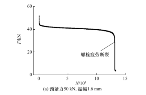 實(shí)驗(yàn)參數(shù)設(shè)置如下:橫向振動(dòng)的頻率為12.5 Hz;振幅分別為0.4、 0.8、 1.2、 1.6、 2.0 mm;對每一個(gè)振幅值,進(jìn)行預(yù)緊力(即初始夾緊力)分別為50、 40、 30、 20 kN的松動(dòng)實(shí)驗(yàn)。預(yù)緊力的選擇依據(jù)如下:國標(biāo)緊固件的扭矩-夾緊力試驗(yàn)標(biāo)準(zhǔn)(GB/T 16823.3—2010)規(guī)定,為了防止螺紋聯(lián)接整體的塑性變形,試驗(yàn)力不應(yīng)超過保證載荷的75%。M16螺栓的保證載荷為91.1 kN,在本實(shí)驗(yàn)的預(yù)緊力作用下(靜態(tài)),螺紋聯(lián)接不會(huì)發(fā)生整體的塑性變形。此外,本研究所有實(shí)驗(yàn)中螺紋聯(lián)接的各摩擦副均處于干摩擦狀態(tài)。
