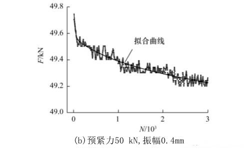 圖2a與2b所示為不同實(shí)驗(yàn)條件的橫向振動(dòng)作用下螺紋聯(lián)接的松動(dòng)曲線。由圖2a可見,夾緊力在松動(dòng)初期經(jīng)歷了快速衰減,之后進(jìn)入緩慢的線形衰減階段。當(dāng)振動(dòng)次數(shù)足夠大時(shí),螺栓疲勞斷裂。圖2b所示為前3 000個(gè)振動(dòng)周期內(nèi)夾緊力曲線在Y方向放大后的觀察結(jié)果,可見夾緊力呈現(xiàn)出波動(dòng)式衰減,但整體上不是線性衰減。