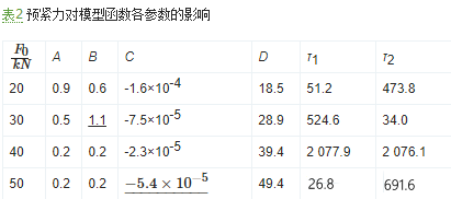 2) 橫向振動(dòng)的振幅越大,模型函數(shù)的參數(shù)A、 B、 C的值越大;預(yù)緊力越小,參數(shù)A、 B、 C的值越大。振幅與預(yù)緊力對模型函數(shù)的時(shí)間常數(shù)τ1、 τ2的影響目前尚不清楚。