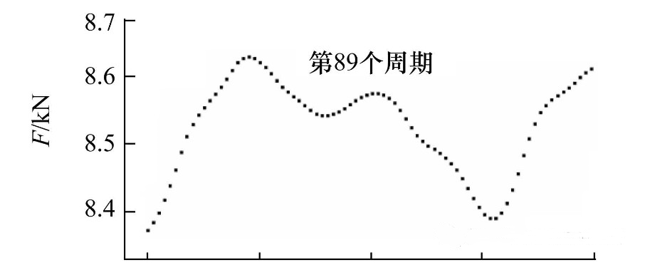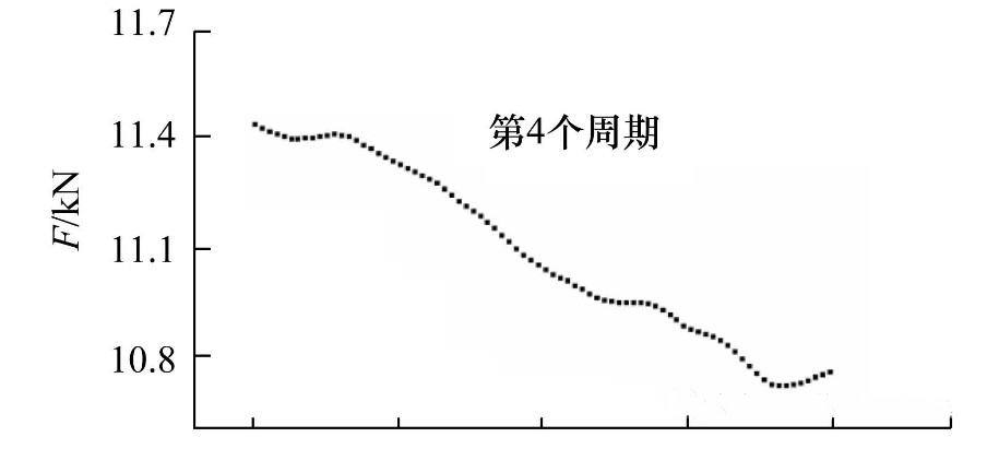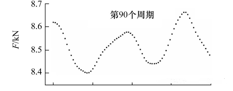 圖5所示為單個(gè)振動(dòng)周期內(nèi)夾緊力與橫向位移的同步變化關(guān)系。單個(gè)振動(dòng)周期的起點(diǎn)定義為上連接板(圖1)位于原點(diǎn)并且向右運(yùn)動(dòng)的時(shí)刻。上連接板的位置由位移傳感器測得(如圖5b所示)。圖5c表明,在橫向振動(dòng)實(shí)驗(yàn)剛開始時(shí)夾緊力快速單調(diào)衰減(圖5c中第3、 4個(gè)周期所示)。第3個(gè)振動(dòng)周期內(nèi),夾緊力減少量高達(dá)1 kN。經(jīng)過最初的快速衰減之后,夾緊力在單個(gè)周期內(nèi)隨著橫向位移的變化而交替增加或減少。在單個(gè)振動(dòng)周期內(nèi)夾緊力與橫向振動(dòng)的位移之間沒有表現(xiàn)出恒定的相關(guān)性(如圖5c中第89、 90個(gè)周期所示)。