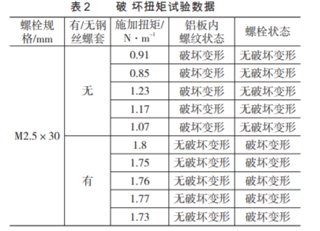 從表2可以看出,標(biāo)準(zhǔn)內(nèi)螺紋的螺紋連接最大破壞扭矩為1.23N.m,而預(yù)裝鋼絲螺套后螺紋連接最小破壞扭矩為1.73N.m,預(yù)裝鋼絲螺套后螺紋連接的破壞扭矩提高40%左右,說(shuō)明預(yù)裝鋼絲螺套確實(shí)大大提高了螺紋連接的破壞扭矩。
