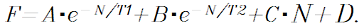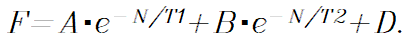 式中: F表示夾緊力,N表示振動(dòng)次數(shù),A、 B、 D、 τ1、 τ2為模型函數(shù)的參數(shù)。式(1)表明松動(dòng)初期存在兩個(gè)指數(shù)衰減過程: A·e-N/τ1主導(dǎo)了圖2b中最初的幾個(gè)至幾十個(gè)振動(dòng)周期內(nèi)夾緊力的急速衰減,B·e-N/τ2主導(dǎo)了夾緊力在隨后的振動(dòng)過程中相對緩慢的非線性衰減。 A·e-N/τ1與B·e-N/τ2可能分別反映了橫向振動(dòng)作用下螺紋聯(lián)接的應(yīng)變松弛過程與摩擦副的磨合(running-in)過程(將在第3節(jié)進(jìn)一步討論)。